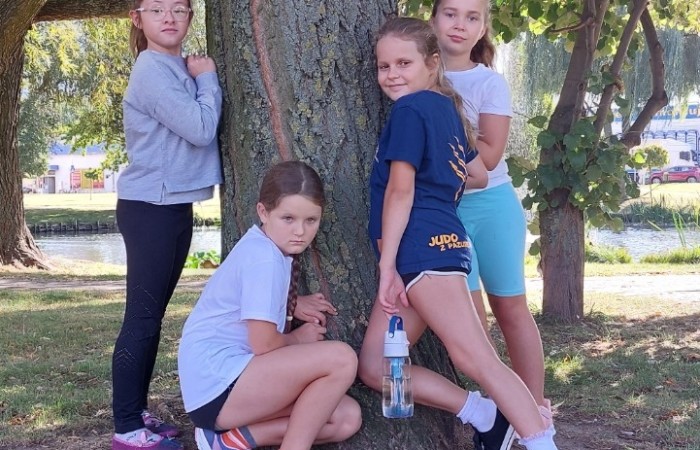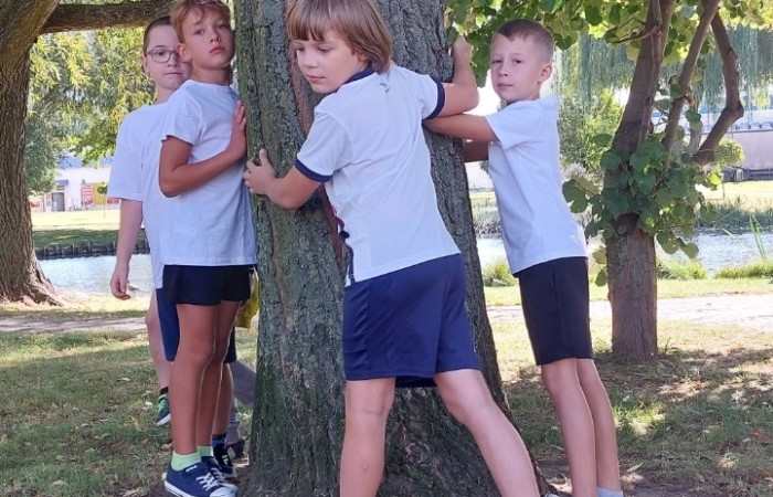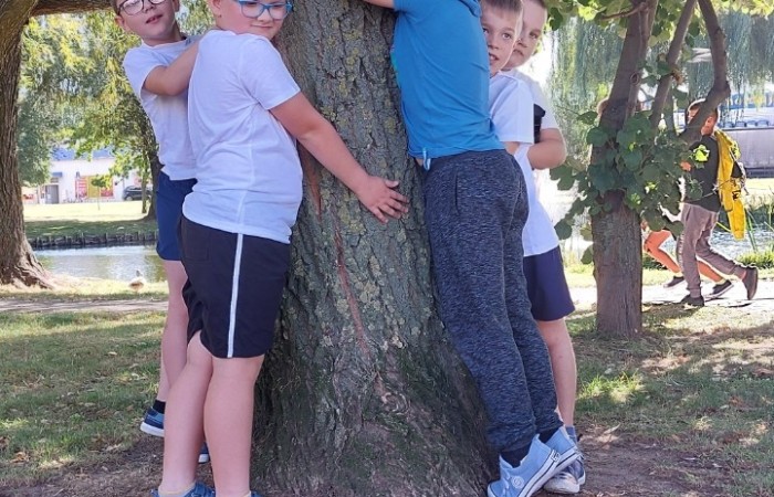 Uczniowie przytulili się do drzewa.